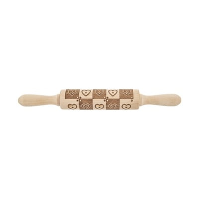 Drewniany wałek kuchenny marki Orion z wytłoczonym kwiatowym wzorem. Wałek jest wykonany z drewna i ma powierzchnię do wałkowania o długości 16 cm.