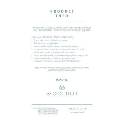 Wooldot to duńska marka, która współpracuje z Nepalem już od 2008 roku. W ich bazie produkcyjnej w Katmandu powstają dywany, poduszki na krzesła, podkładki, koszyki inne dodatki ze 100% wełny.