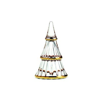Choinka wykonana jest z prasowanego szkła z ręcznie malowanymi detalami w kolorze złotym i świetnie wygląda w połączeniu z