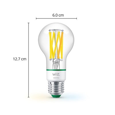 Inteligentna żarówka filamentowa marki WiZ to najbardziej energooszczędna żarówka w systemie inteligentnego oświetlenia WiZ. Dzięki klasie energetycznej A zużywa o 40% mniej energii niż standardowe żarówki LED.