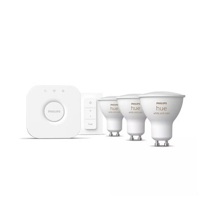 Zestaw startowy Philips Hue zawiera wszystko, czego potrzeba do stworzenia inteligentnego oświetlenia w domu. Zestaw zawiera mostek Hue Bridge, trzy inteligentne żarówki możliwością regulowania barwy światła i włącznik ze ściemniaczem, który pozwala od razu zacząć sterować oświetleniem według własnych upodobań.