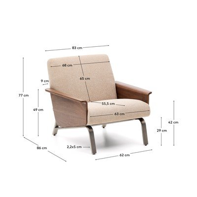 Konstrukcja fotela łączy w sobie wytrzymałą sklejkę o grubości 18 mm, pokrytą dębową okleiną, z estetycznie wyprofilowanymi podłokietnikami. Całość uzupełniają nogi ze szczotkowanej stali nierdzewnej o średnicy 1,8 mm, które podkreślają nowoczesny i stabilny wygląd mebla. Siedzisko fotela zapewnia idealną, średnią twardość, doskonałą do codziennego użytkowania. Jest to zasługa przemyślanego połączenia pasów, sprężyn oraz warstw pianki o wysokiej gęstości (35 kg/m³ i 40 kg/m³), co gwarantuje trwałość, wytrzymałość i wyjątkowy komfort.