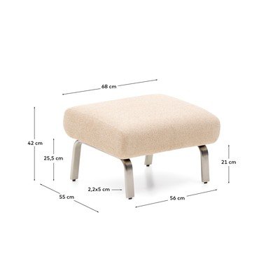 Nogi z szczotkowanej stali nierdzewnej o średnicy 1,8 mm mają elegancko zaokrąglony kształt, zapewniając podnóżkowi nowoczesną i stabilną podstawę. Siedzisko oferuje średnią twardość, idealną do codziennego użytku. Osiągnięto to dzięki połączeniu pasów, sprężyn i warstw pianki o wysokiej gęstości (35 kg/m³ i 40 kg/m³), które gwarantują wytrzymałość, trwałość i doskonały komfort.