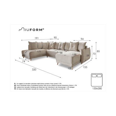 Narożnik Lazy LukkaSztruksowy, rozkładany/ze schowkiem, lewostronny/w kształcie litery U, jasnobrązowy, powyżej 4 osób, szerokość 320 cm, głębokość 191 cm, głębokość siedziska 58 cm