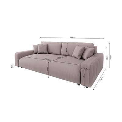 Sztruksowa, rozkładana/ze schowkiem, jasnoróżowa, trzyosobowa, szerokość 234 cm