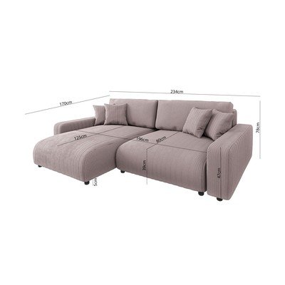 Sztruksowy, rozkładany/ze schowkiem, prawostronny/lewostronny/strona zmienna/z szezlongiem, jasnoróżowy, trzyosobowy, szerokość 234 cm
