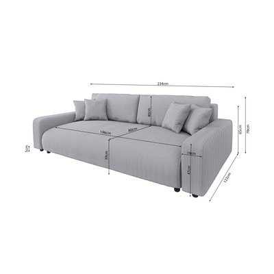 Sztruksowa, rozkładana/ze schowkiem, jasnoszara, trzyosobowa, szerokość 234 cm