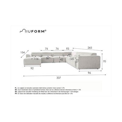 Prawostronny/w kształcie litery UJasnoszaryPowyżej 4 osóbSzerokość 337 cmGłębokość 265 cmGłębokość siedziska 58 cm