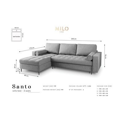 Rozkładany narożnik Santo zapewnia mnóstwo przestrzeni do relaksu dla całej rodziny i dodaje wnętrzu odrobinę luksusu. Tkaniny używane przez markę Milo Casa poddawane są rygorystycznym testom, aby zagwarantować najwyższą trwałość, komfort i atrakcyjny design.