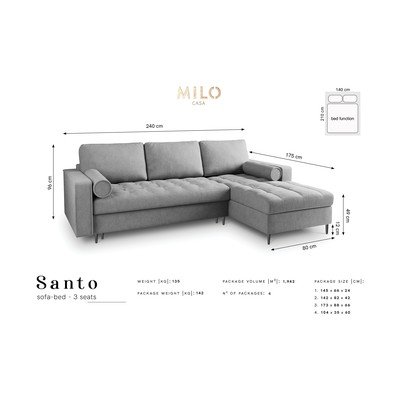 Rozkładany narożnik Santo zapewnia mnóstwo przestrzeni do relaksu dla całej rodziny i dodaje wnętrzu odrobinę luksusu. Tkaniny używane przez markę Milo Casa poddawane są rygorystycznym testom, aby zagwarantować najwyższą trwałość, komfort i atrakcyjny design.