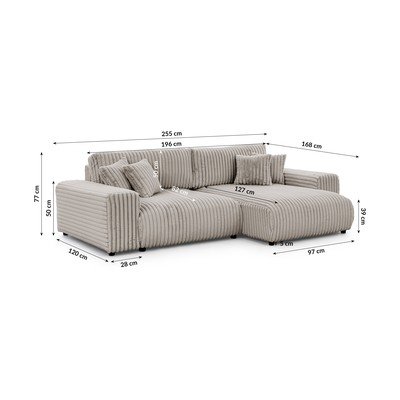 Sztruksowy, rozkładany/ze schowkiem, prawostronny, jasnoszary, wodoodporny/plamoodporny, trzyosobowy, szerokość 255 cm
