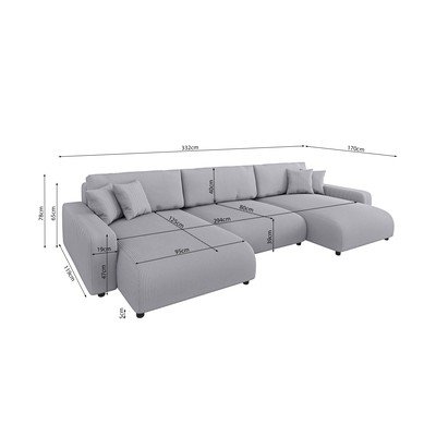 Sztruksowy, rozkładany/ze schowkiem, w kształcie litery U, jasnoszary, powyżej 4 osób, szerokość 332 cm
