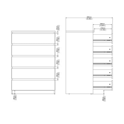 Pięć pojemnych szuflad na stalowych prowadnicach kulkowych zapewnia mnóstwo miejsca na rzeczy osobiste. Dekor dębu nadaje komodzie naturalny wygląd, który łatwo wkomponować w różne style wnętrz. Konstrukcja bez uchwytów podkreśla czyste linie i nowoczesną estetykę.