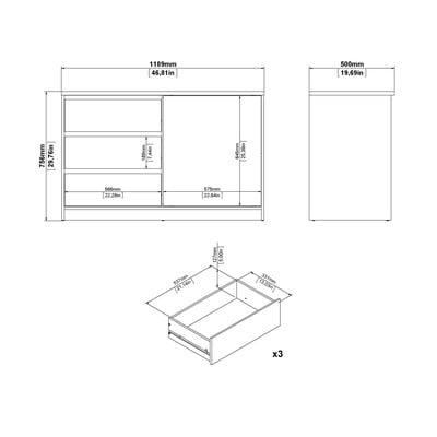 Po lewej stronie znajdują się trzy pojemne szuflady, a po prawej szafka z przesuwanymi drzwiami i półką. Prosty i nowoczesny design pasuje do różnych wnętrz.