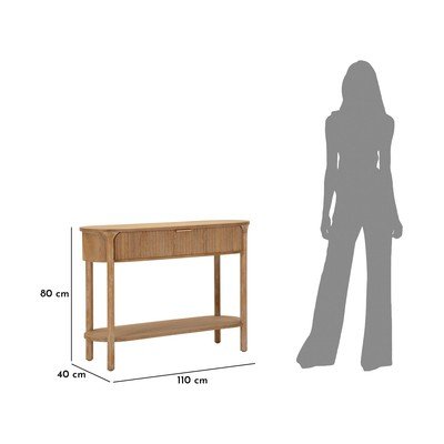 Konsola wyposażona jest w praktyczną szufladę do przechowywania drobiazgów, której wymiary wewnętrzne wynoszą 81,5 x 30 x 11 cm. Pomiędzy górną i dolną półką znajduje się przestrzeń 44 cm, zapewniająca dodatkowe miejsce na dekoracje lub przechowywanie. Konstrukcja z cienkimi nogami sprawia, że mebel wygląda na przewiewny i lekki.