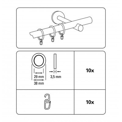 10-częściowy zestaw krążków z haczykami marki Gardinia idealnie pasuje do karniszy z kolekcji Elba na przykład o długości