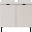 Szafka wyposażona jest w dwoje drzwiczek i regulowaną półkę o nośności do 10 kg. Górna półka ma wycięcie na syfon i może unieść do 3 kg, podczas gdy dolna ma nośność do 10 kg. Szafka stoi na czterech czarnych metalowych nóżkach i posiada czarne metalowe uchwyty.