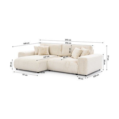 Sztruksowy, rozkładany/ze schowkiem, lewostronny, kremowy, wodoodporny/plamoodporny, trzyosobowy, szerokość 255 cm