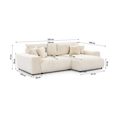 Sztruksowy, rozkładany/ze schowkiem, prawostronny, kremowy, wodoodporny/plamoodporny, trzyosobowy, szerokość 255 cm