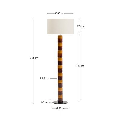 Lampa stojąca Mavran marki Kave Home wyróżnia się podstawą z glazurowanej ceramiki, złożoną z pasów, które tworzą dynamiczny wygląd i dodają każdemu pomieszczeniu wyjątkowego charakteru. Jej smukła, pionowa konstrukcja o wysokości 146 cm pięknie prezentuje się w przestrzeni, a glazurowane wykończenie podstawy dodatkowo przyciąga wzrok.