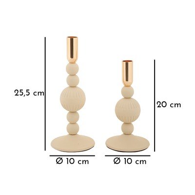 Jeden świecznik ma 10 cm średnicy i 20 cm wysokości, a drugi 10 cm średnicy i 25,5 cm wysokości. Otwór na świecę ma średnicę 2,5 cm. Dzięki swojemu designowi idealnie nadaje się do stworzenia eleganckiej atmosfery na stole lub komodzie.