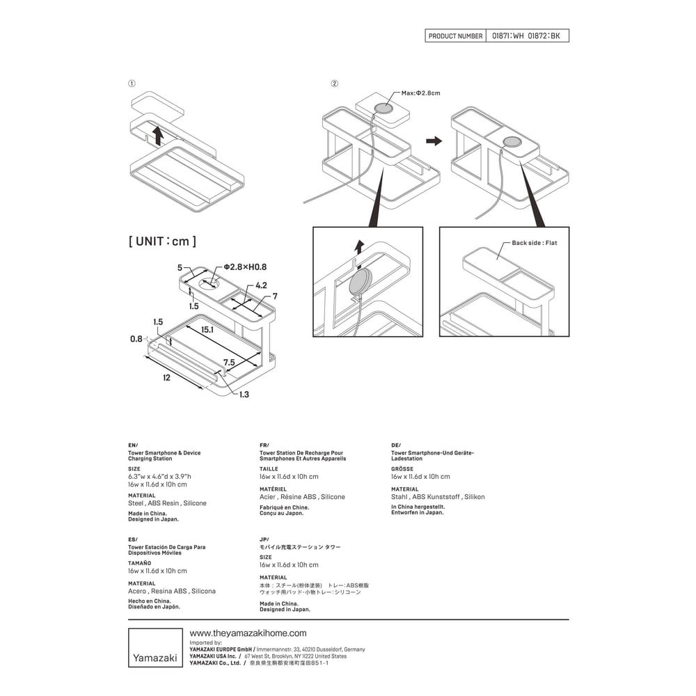 Poręczny stojak Yamazaki umożliwia przechowywanie i ładowanie wszystkich urządzeń w jednym miejscu. Na górze znajduje się otwór na kabel i silikonowa podkładka na smartwatch. Na dole znajduje się uchwyt na telefon, tablet i miejsce na inne akcesoria.