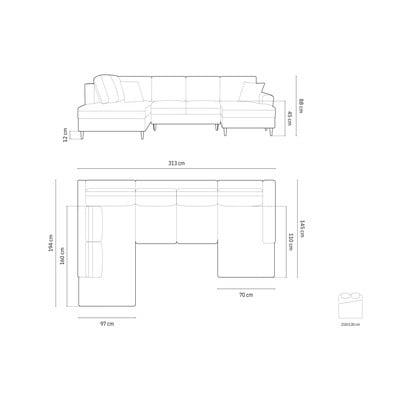 Aksamitny, rozkładany/ze schowkiem, lewostronny/w kształcie litery U, morski, powyżej 4 osób, szerokość 313 cm