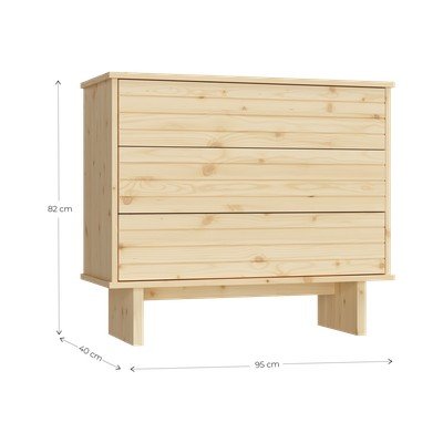 Komoda Kommo to doskonały mebel do przytulnego wnętrza. Wykonana jest z jasnego drewna sosnowego. Przestrzeń do przechowywania składa się z trzech szuflad. Mechanizm push to open nadaje komodzie minimalistyczny wygląd, sprawiając, że nie posiada ona uchwytów.