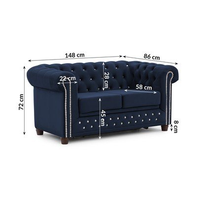 Aksamitna, rozkładana, typu chesterfield, niebieska, wodoodporna/plamoodporna, dwuosobowa, szerokość 148 cm