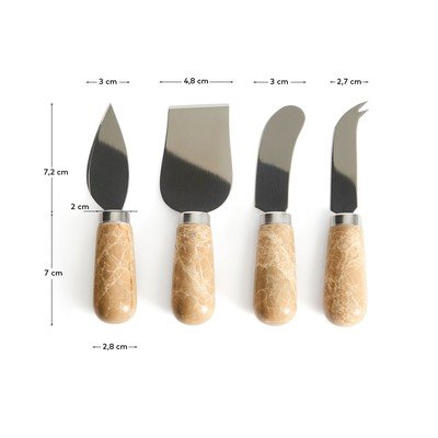 Zestaw noży do sera Adoma marki Kave Home jest częścią eleganckiej kolekcji, która wyróżnia się wyrafinowanym i ponadczasowym charakterem. Każdy z czterech elementów został wykonany z wytrzymałego marmuru i uzupełniony detalami ze stali nierdzewnej, nadając całości nowoczesny i stylowy wygląd.