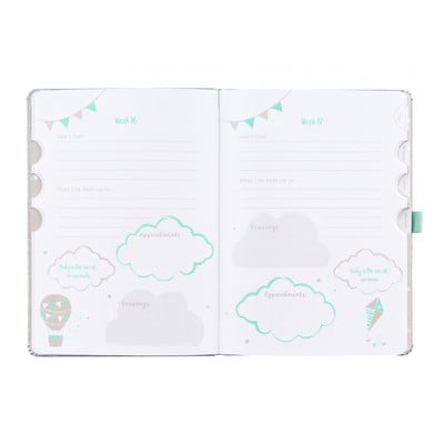 Dziennik podzielony jest na 4 części: pamiętnik, planer, plan porodu i wczesne dni. Posłuży Ci jako przewodnik po ciąży, w którym będziesz mogła zapisywać kamienie milowe i badania lekarskie od 4 tygodnia ciąży do porodu.