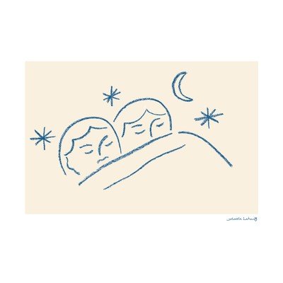 Plakat Slumber – Amélie Lehoux marki The Poster Club wprowadza do wnętrza delikatny motyw dwóch śpiących postaci przytulających się do siebie pod gwiazdami i księżycem. Dzięki prostemu, ale gustownemu designowi, przywołuje poczucie spokoju.