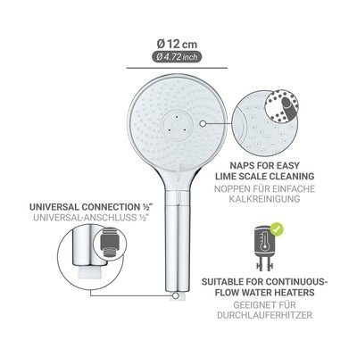 Dzięki regulatorowi WaterSaving, natężenie przepływu można dostosować do zaledwie 9 litrów na minutę, co oznacza oszczędność co najmniej 35% w porównaniu ze standardowymi słuchawkami prysznicowymi. Słuchawka o średnicy 12 cm nie tylko poprawia wygląd łazienki, ale także pomaga chronić środowisko, oszczędzając wodę i energię.