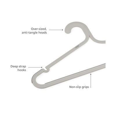 Haczyki wieszaków Orderly są płaskie i duże, co ułatwia ich zakładanie i zdejmowanie z drążka szafy. Ich kształt zapobiega również nakładaniu się i zaczepianiu wieszaków lub ubrań. Silikonowe powierzchnie antypoślizgowe na ramionach i drążku do spodni zapewniają stabilność odzieży. Głębokie haczyki służą do wygodnego zawieszania ramiączek sukienek i szlufek spódnic.