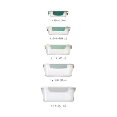 W zestawie znajduje się pięć pojemników o pojemności 230 ml, 540 ml, 1,1 l, 1,85 l i 3 l. Po złożeniu mają wymiary 20 x 24,5 x 16,3 cm.