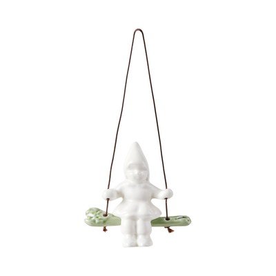 Biała, szkliwiona ceramiczna ozdoba świątecznaprzedstawiająca dziewczynkę w świątecznej czapce i drewniakach, która siedzi na zielonej, matowo szkliwionej huśtawce, przywołuje wspomnienia przyjemnych chwil spędzonych w zimowej scenerii.