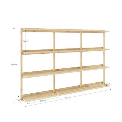 Regał wykonany jest z drewna sosnowego w naturalnym kolorze. Czyste linie i lekkie proporcje nadają mu niemal pływający wygląd, a wyrafinowane połączenia dodają subtelnego, ale wyrafinowanego akcentu. Wymiary regału to 192 x 127 cm.