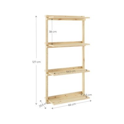 Regał wykonany jest z wysokiej jakości drewna sosnowego w naturalnym kolorze, nadając mu elegancki i ponadczasowy wygląd. Jego wymiary 66 x 127 cm pozwalają na efektywne wykorzystanie przestrzeni na ścianie.