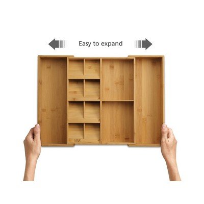 Regulowany bambusowy organizer na sztućce do szuflady DrawerStore Bamboo marki Joseph Joseph to sprytne rozwiązanie, które pomoże Ci utrzymać porządek w kuchennej szufladzie. Dzięki przemyślanemu układowi, w którym sztućce wkłada się pod kątem, jedne nad drugimi, zaoszczędzisz ponad połowę miejsca. Co więcej, możesz je wkładać do oznaczonych przegródek dwustronnie.