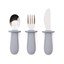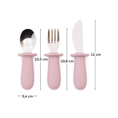 W skład zestawu wchodzą łyżeczka, widelec i nóż. Każdy z trzech elementów posiada solidne, ergonomiczne uchwyty wykonane z silikonu, idealnie dopasowane do małych rączek dziecka. Metalowe części są trwałe, a ostrze noża jest tępe i bezpieczne dla najmłodszych.