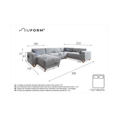 Rozkładany/ze schowkiemPrawostronny/w kształcie litery URóżowyPowyżej 4 osóbSzerokość 330 cmGłębokość 212 cmGłębokość siedziska 58 cm