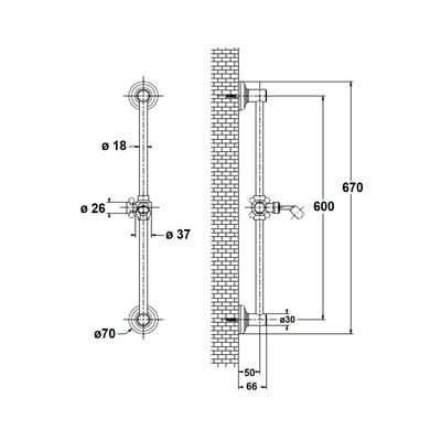 Drążek prysznicowy (o długości 67 cm, łącznie z zaślepkami) jest wyposażony w przesuwny uchwyt na słuchawkę prysznicową. Rozstaw śrub montażowych wynosi 60 cm.