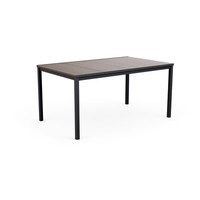 Stół łączy w sobie trwałą metalową konstrukcję z plastikowym blatem w dekorze orzecha, który wiernie imituje drewno. Takie połączenie zapewnia nie tylko atrakcyjny wygląd, ale także wysoką odporność na warunki atmosferyczne.