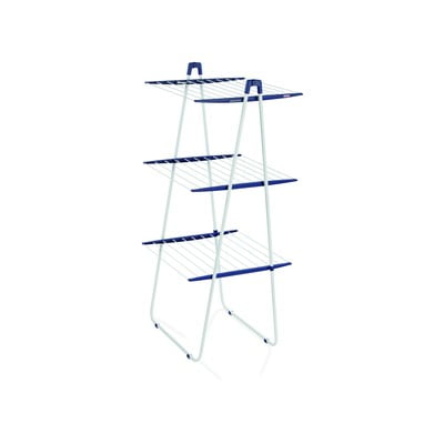 Praktyczna trzypiętrowa suszarka zmieści się w nieużywanych kątach lub pod prysznicem. Otrzymasz nawet 19 m powierzchni suszenia, czyli mniej więcej dwa prania. W razie potrzeby środkowy poziom można złożyć, dzięki czemu suszarka nada się do suszenia długich ubrań.