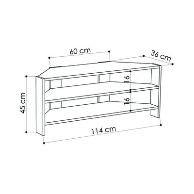 NarożnaW dekorze dębuZ płyty MDFPowłoka: melaminaW naturalnym kolorzeSzerokość 114 cmWysokość 45 cmGłębokość 36 cm