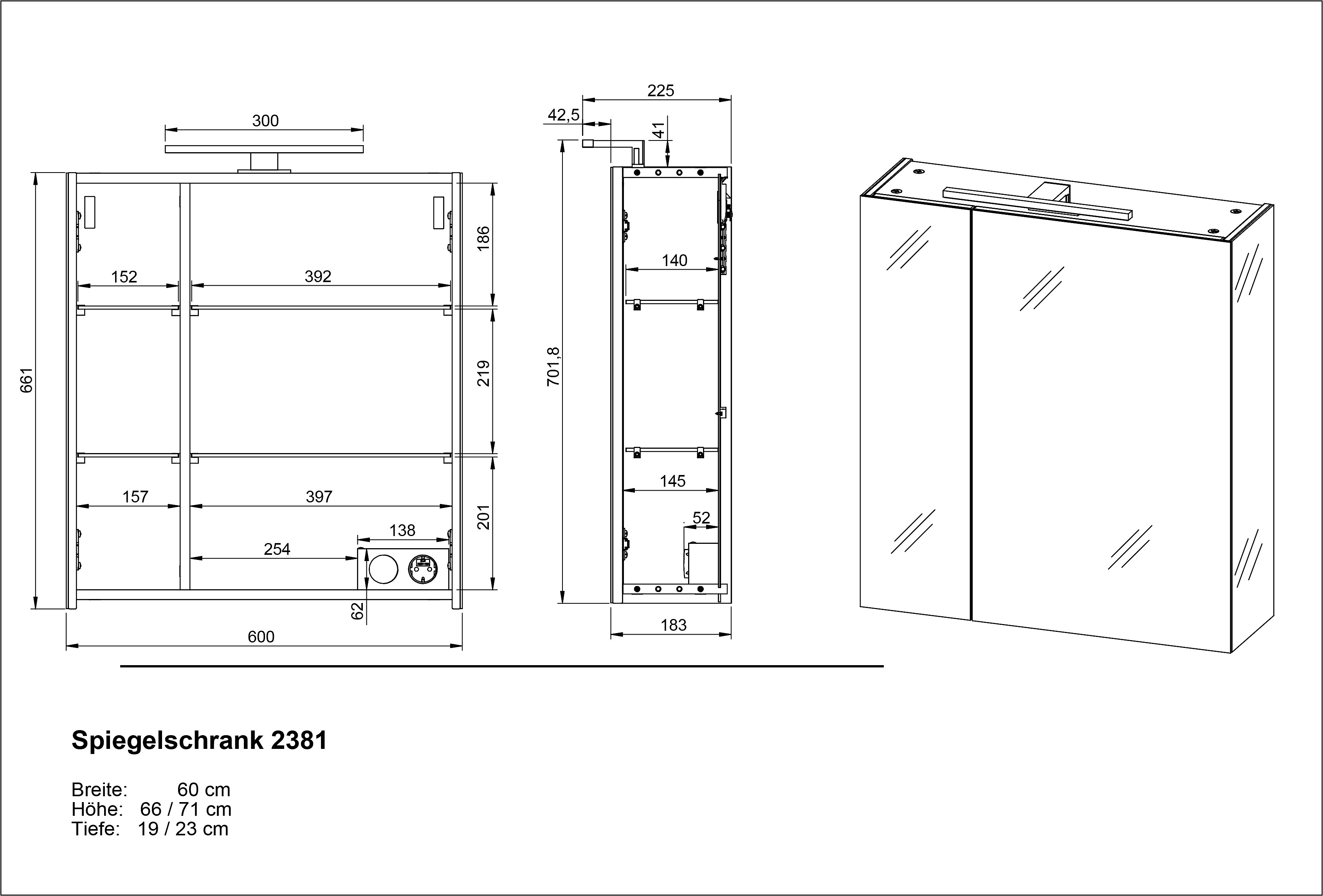 Wisząca/z lustrem/z oświetleniem, z płyty wiórowej, powłoka: melamina, szara, szerokość 60 cm, wysokość 71 cm, głębokość 23 cm