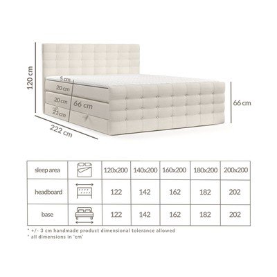 Materac dolny o wysokości 20 cm składa się ze sprężyn bonellowych i pianki poliuretanowej. Materac górny ma siedem stref twardości – dla głowy, ramion, lędźwi, miednicy, ud, łydek i stóp.