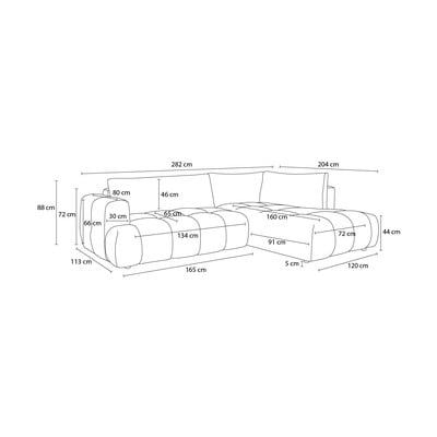 Z tkaniny szenilowej, rozkładany/ze schowkiem, prawostronny/w kształcie litery L, szarobrązowy, czteroosobowy, szerokość 282 cm
