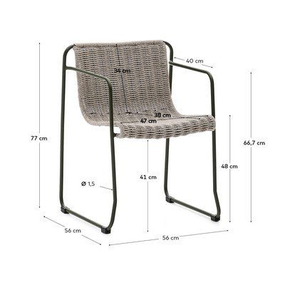 Szarozielone metalowe krzesło ogrodowe Maurina marki Kave Home to mebel, który wyróżnia się designem stworzonym przez studio Yonoh specjalnie dla marki Kave Home. Siedzisko i oparcie wykonano z ręcznie tkanej plecionki, która jest odporna na promieniowanie UV. Dzięki temu krzesło zachowa swój wygląd i funkcjonalność nawet przy częstym użytkowaniu na zewnątrz.