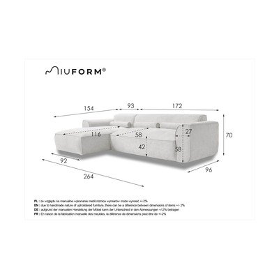Lewostronny/z szezlongiemCiemnoszaryTrzyosobowySzerokość 264 cmGłębokość 154 cmGłębokość siedziska 58 cm